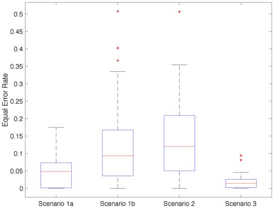 Figure 10 shows the EER distribution among participants for each scenario in their best configuration. Participants in Scenario 3 had a relatively uniform behaviour, with two outliers—participants 5 and 16. Scenario 1a showed a similar behaviour to Scenario 3, but with a wider distribution of values. Scenarios 1b and 2 showed very heterogeneous EER with the same outliers as in 3. We suspect that the variability of classifier quality in these two scenarios came from the noise while walking in Scenario 1b and the absence of samples from activity 3 in Scenario 2.