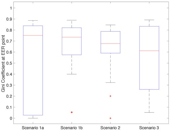 Figure 11 shows the distribution of Gini coefficients among participants for the best configuration in each scenario (operating at the EER) [20]. A Gini coefficient closer to 1 means that the same participant would be able to systematically authenticate as the target user, defeating the purpose of the system. A Gini coefficient closer to 0 means that errors were distributed equally among the participants, reducing the risk of systematic bypass. All scenarios had a high but similar median. This implies that many of the errors generated by the classifiers came from the same users. This is especially worrying for Scenarios 1b and 2, as they had a relatively high EER and Gini coefficients. Participants who can bypass the system in these cases can do it consistently. For Scenarios 1a and 3, many participants had relatively low Gini coefficients. In conjunction with the low EER, this implies that in most cases, it is difficult to find a participant that can impersonate another participant consistently.