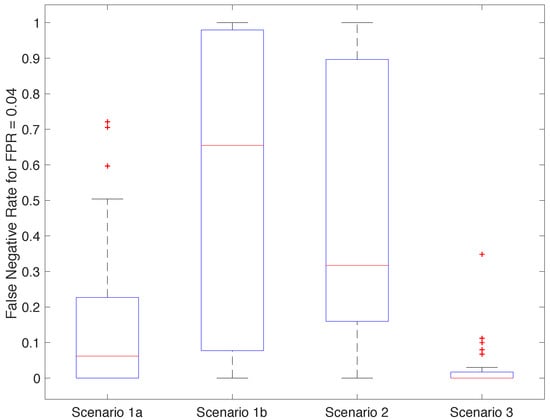 Distribution of the false negative rate (FNR) obtained for each participant and scenario with false positive rate (FPR) = 0.04.
