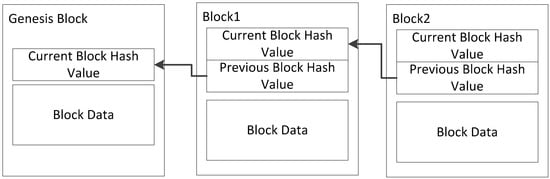 Blockchain technology first came to prominence in early 2009 through the crypto-currency bitcoin (BTC). Bitcoin users use a variable public key (PK) to generate transaction information and broadcast it to the network for the transfer of funds. The transaction information is stored by all users in its own block. Once the block is full, a network mining process is performed; the block’s hash value is calculated, and the encrypted information and blocks are appended to the block chain. In order to mine the cryptographic hash value of a block, certain nodes in the network, known as miners, compete to solve a resource consumption cryptographic puzzle called proof of work (POW) []. The node that first solves the puzzle and gets everyone’s approval is considered to have tapped the block. BTC has flourished, and blockchain could, according to Swan [], have far-ranging consequences for all aspects of modern society. This is because blockchain technology keeps all transaction data accounts through all members, and all members update the accounts simultaneously to maintain completeness when new transactions occur. Internet and encryption technologies are the underlying technologies that enable all members to verify the reliability of each transaction so that a single point of failure caused by a traditional third-party-authorized transaction is resolved. The blockchain has the characteristic of being broker-free (P2P-based), so the transaction eliminates unauthorized costs by the third party. Since everyone keeps the transaction information in sync, the modify records hacking effect of the single-point mode becomes very limited and often does not work. In addition, users of a blockchain system can openly access transaction records and reduce transaction supervision costs. Since the hash value stored in each peer in the block is affected by the value of the previous block, forging and changing data requires modification of the entire chain, and the amount of single-point calculation is far behind the calculation of the entire network. As a result, counterfeiting is almost impossible. Although data changes are possible if 51% of the calculations are involved in forgery, the record modify is very difficult to implement in a network-scale environment []. The blockchain network is constructed of many smart devices, and each device is considered to be a node. The blockchain node contains a data link as shown in Figure 1. Each data link includes many data blocks which contain the previous block hash and some transaction information as block data.