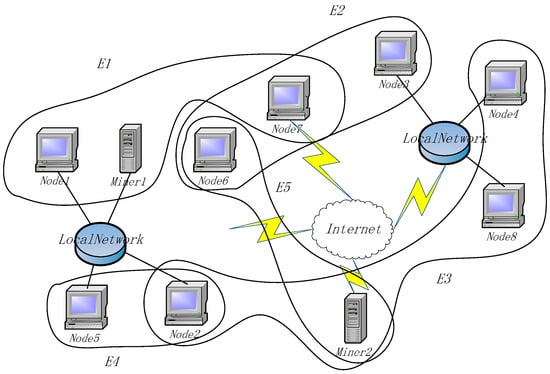 In Figure 3, devices are randomly contained in five hyperedges, whether they are connected in the network or not. As shown in Figure 3, this simple blockchain network contains 10 nodes (named Node1 to Node10) and two miners (named Miner1 and Miner2). We take the nodes and miners as vertexes set V. There are five hyperedges in the network, E1 to E5. As can be seen from Figure 3, the blockchain network is mapped to a hypergraph, where the devices are nodes in the graph, and each hyperedge corresponds to a set of devices. There are associated nodes between the hyperedges, that is, a device belongs to two or more hyperedges at the same time. For example, Node6 in Figure 3 belongs to hyperedge E2 and also belongs to hyperedge E5. Devices that belong to the same hyperedge may or may not be in the same local network, either as nodes or as miners. The objects in the architecture are explained as follows: