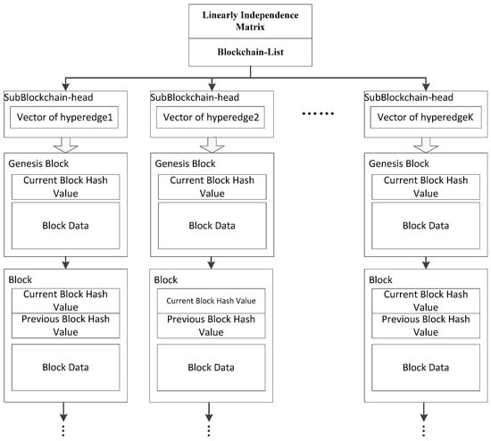The structure of storage in each node is designed with two parts: the blockchain head and SubBlockchains. The blockchain head is constructed by a linear independence matrix, a vector and a Blockchain-list. The linear independence matrix is an N-order integer matrix consisting of N linearly independent vectors, each of which map to a hyperedge as its feature. N represents the number of hyperedges in the network. That means for each hyperedge in the blockchain network, there is an N-dimensional vector associated with it. The vector can be regarded as the ID of the hyperedge. The reason why we use a linear independence matrix is that when the network evolves, it is difficult to generate a new ID for a new hyperedge synchronously, but it is easy to generate a linear independence vector from a linear independence matrix.