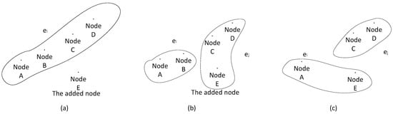 Adding a node and deleting a node from a network, (a) before Node E is added, (b) after Node E is added, (c) after Node B is deleted.