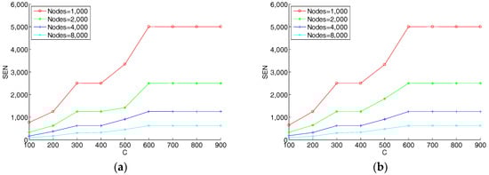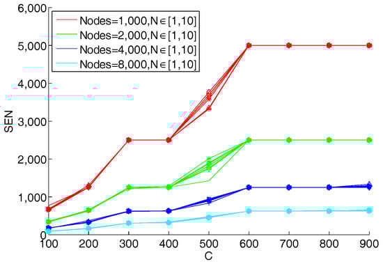 In this section we discuss the parameters of the hypergraph-based blockchain network. We study the effect of network parameters on storage efficiency. As discussed in Section 3.3.1, the main parameters are the graph’s degree N and the count of the upper limit of nodes in hyperedge C. These parameters affect the average storage in each node (SEN), or the used memory in each node. The methodology of the designed experiments is that: For a given value of C and a number of total nodes in the network we calculate the average storage capacity of nodes and draw the figures. In the following experiments, we assume that the number of transactions in the network is 104. The results are shown in Figure 7. From Figure 7, we can see that with a given N, if the value of C increases, the average record storage capacity of each node continuously increases. The reason is that with the increase of C, the number of nodes in each hyperedge increases, while the number of hyperedges decreases. Each transaction record is stored by more nodes, so that the average storage in each node increases. On the other hand, it also can be seen that the smaller the number of nodes in the graph, the greater the storage capacity of each node. With the same number of transaction records and C values, the smaller the number of nodes, the smaller the corresponding number of hyperedges. Under the premise that the distribution of nodes in each hyperedge is the same, there are more transaction data records in each hyperedge in a graph with fewer hyperedges, resulting in a larger average storage capacity for each node. In particular, when C is equal to the number of nodes in the hypergraph, the proposed model will degenerate into the original blockchain model.