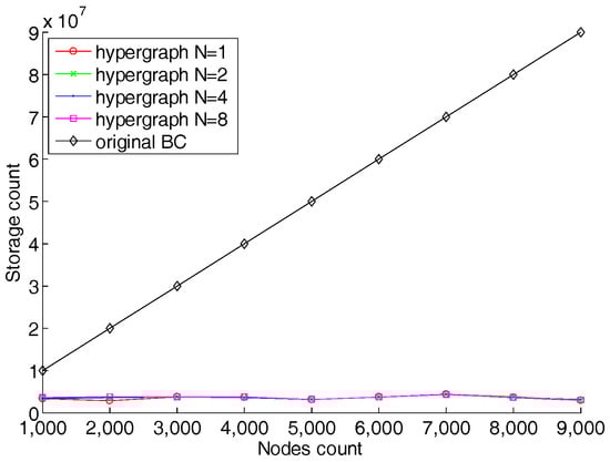 Furthermore, we found that for different N, the curves in the images are very similar. Therefore, we superimposed different curves of N from 1 to 10, and the results are shown in Figure 8. It can be seen from Figure 8 that the graph’s degree N of the hypergraph has almost no effect on the average storage of each node. That means the storage of each node is only related to the number of transactions and C. In order to prove the advantage of the hypergraph-based blockchain model, we compared the total used memory capacity in the model with the original blockchain model. The results are shown in Figure 9. The original blockchain stores all records in all nodes, so the used memory capacity for the whole network is in proportion to the number of transactions. It can be clearly seen from Figure 9 that the model proposed in this paper is much smaller than the original blockchain model in terms of overall network storage consumption, and it also shows that the total storage quantity is basically independent with the graph’s degree N.