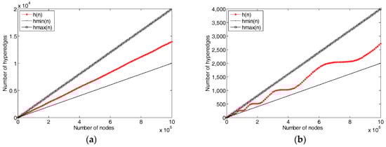 In Section 3.6, we designed a hyperedge splitting algorithm for the evolution of network structure, which affects the average cardinality of the graph. The algorithm guarantees the cardinality of each hyperedge between co-rank(C/2) and rank(C). Therefore, as the number of network nodes increases, the number of network hyperedges will change, but a lower bound and an upper bound will be guaranteed. Let hmin(n) denote the min count of hyperedges in a n vertexes hypergraph and hmax(n) to the max. Depending on the algorithm, we get the following formulas: