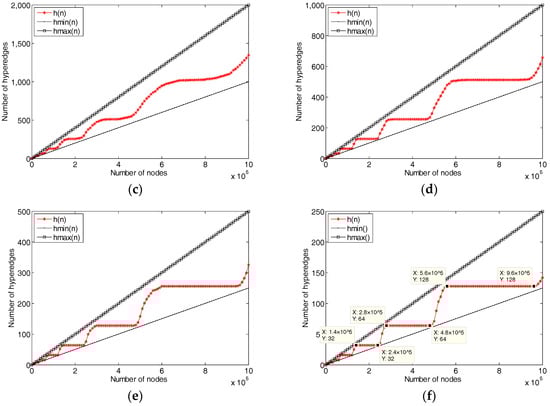 We designed experiments to verify this characteristic of the network, and the results are shown in Figure 10. Figure 10 shows that with the increase of C, the capacity of each hyperedge increases, and the change of hyperedge number is more and more stepwise, which is in line with the description of Equation (3). Particularly, in Figure 10f, the height and length of each step is almost twice that of the previous level, which is consistent with the analysis results.