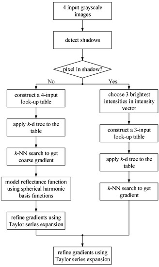 - If it is a non-shadowed pixel, it complies with the Lambertian reflectance and we can use the photometric stereo method to find the local gradient. A LUT is created that relates the image intensity measured from the 4 images taken using different flashing LEDs and the gradient based a known object. Then the k-NN search algorithm is used to find the gradient value with the measured intensity. In order to accelerate the searching speed, the data structured k-d tree is applied to the LUT. A coarse gradient value is obtained with the above steps, and the next step is to refine it. As the Lambertian object can be approximated by a low-dimensional linear subspace, the reflectance function of the calibration object is modeled using the spherical harmonic basis functions. The accurate gradient values are obtained by a first-order Taylor series expansion in the neighborhood of the coarse gradient values.