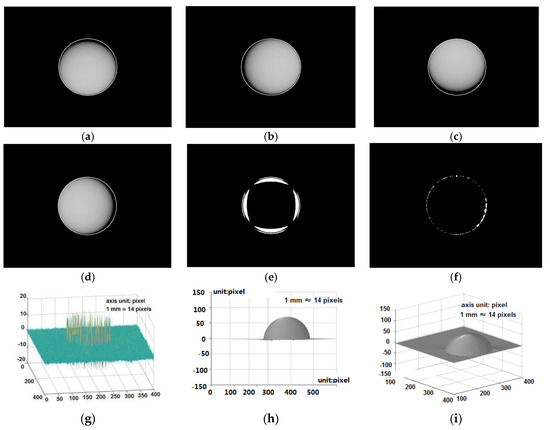 The 3-D reconstruction of the “unknown” sphere with a radius of 5 mm is shown in Figure 6. Figure 6a–d give the sphere images with the shadow. The shadow detection result is given in Figure 6e. The absolute value of the 3-D reconstruction error projected to the bottom plane is given in Figure 6f with the white regions representing the reconstruction error larger than 10%. As show in Figure 6g, the reconstruction error peaks at the edge of the sphere, and the maximum reconstruction error is less than ±15 pixels, in contrast to the sphere height of 70 pixels which is actually 5 mm. The 3-D reconstruction results of this object are shown in Figure 6h,i. Through this simulation, it is found that the proposed tactile sensor may still introduce error for object surface regions with very steep gradient change, but much smaller than that without the proposed method.