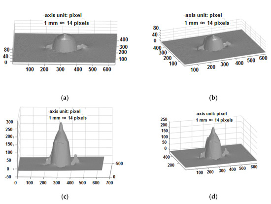 In the experimental prototype built to validate the proposed method, the image sensor is mounted vertically on top of the sensing layer. The image sensor is equipped with a Tamron lens (AF70-300 mm F/4-5.6 Macro 1:2), which aims at the center of the deformation sensing layer at a distance of 1 m. Four white LEDs in the prototype are evenly spaced on a circle with a radius of 3 cm, and the height difference between the LEDs and the sensing layer is 20 cm. Note that the prototype sensor is built to validate the method proposed, and in a practical sensor implementation in the near future, a macro lens will be used to dramatically scale down the tactile sensor size so it can be fitted into a robotic finger. A CMOS image sensor (CIS) with a dedicated macro lens can provide a minimum object distance of 5 mm, and the circuit board width is expected to be less than 10 mm with a CIS package smaller than 3 mm × 3 mm, which means it can be easily placed in a robotic finger with the size close to the real finger. The typical 2-D deformation images with different objects (a small mascot with a length of about 2 cm, and a rigid sphere with a radius of 7 mm) taken by the prototype sensor are given in Figure 3. The 2-D images are processed using the algorithm in the following section to reconstruct the 3-D surface shape.