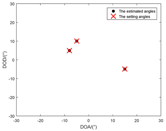 where and . The least squares (LS) or the total least squares (TLS) technique is applied to Equation (21) for estimating and . Then, the estimation of can be obtained through the EVD of , and supposing be the eigenvector matrix of . To achieve the estimation of the DOAs paired with the estimated DODs, calculate the via . Finally, the DODs and DOAs are derived as