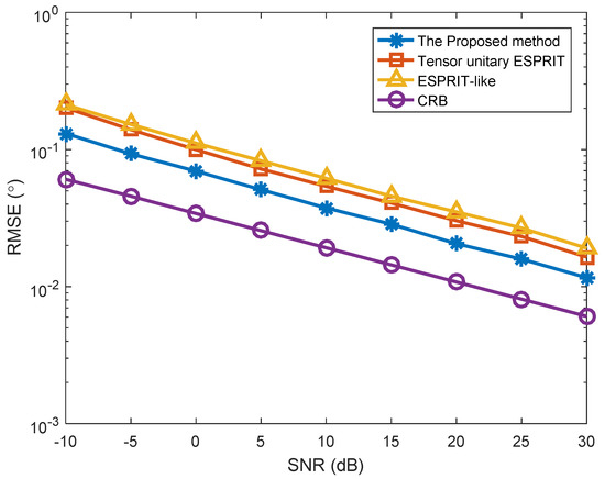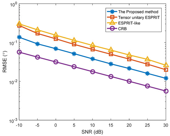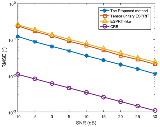 In this part, some numerical experiments are carried out to prove that the proposed algorithm has superior angle estimation performance. ESPRIT-like algorithm [14], Tensor unitary ESPRIT algorithm [23] and Cramer–Rao bound (CRB) [14] were compared with the proposed method. In these simulations, the bistatic MIMO radar is made up of transmit antennas and receive antennas, both of which are composed of half-wavelength spaced uniform linear arrays (ULAs). Unless stated otherwise, it was assumed that there are uncorrelated targets, located at , and . The root mean square error (RMSE) was utilized to achieve the evaluation of angle estimation performance, which is expressed as