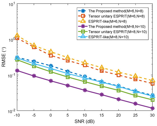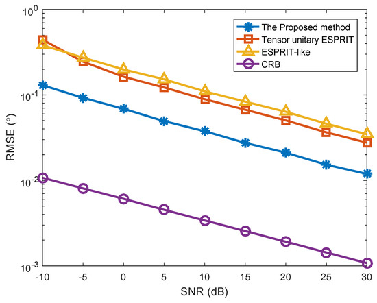 The fourth simulation describes the RMSE versus snapshots of different algorithms for targets, where SNR = 0 dB and the mutual coupling is set as Case (1). In Figure 7, the performance of all algorithms improved with more snapshots. The performance of our proposed algorithm is superior to that of several other methods in general, but the performance of the Tensor unitary ESPRIT method is slightly better than the proposed method under very low snapshots, which is because the Tensor unitary ESPRIT method increases the number of snapshots effectively by spatial smoothing. When the number of snapshots is greater than a specific threshold, the performance of the proposed method is superior to that of Tensor unitary ESPRIT method and ESPRIT-like method, and is very close to CRB. In addition, the performance of the Tensor unitary ESPRIT method is close to the performance of the ESPRIT-like method under the condition of large snapshot number, but it is still inferior to the proposed method.