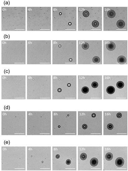 Using the lens-less imaging system [16], time-lapse images of colony formation of five Staphylococcus spp. were obtained. (Figure 1, see also Supplementary Information Figure S1). It should be noted that, in our previous study [16], we already confirmed that colony fingerprints were reproducible even when different operators did the experiments using different culture lots. It was observed that all of the five species generated round-shaped colony fingerprints. In general, a region with high intensity (shown as a central white dot) were surrounded by a region with low intensity (shown in black) at the initial stages of the colony formations (e.g., typically Figure 1a,b,d, at 8 h). The regions with low intensity expanded outward during the growth of colonies, while a white ring was observed on the inner side of the outer edge (e.g., typically Figure 1a–e, at 16 h). Characteristic white dots at the central area were also observed (e.g., typically Figure 1a,b,d,e, at 16 h).