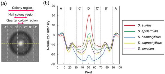 Intensity profiles across the colony fingerprints of Staphylococcus spp. (a) Intensities were profiled along a yellow line (100 pixel in length) across the colony fingerprints. (b) Profiles of the average values of 25 colonies of S. aureus (red), S. epidermidis (green), S. haemolyticus (blue), S. saprophyticus (yellow), and S. simulans (purple). The intensity values were normalized by subtracting the intensity values at the randomly selected non-colony region. (A and A’) non-colony region, (B–B’) colony region, (C–C’) half colony region, (D) quarter colony region.