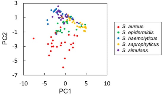 Principal component analysis (PCA) was first carried out with the 14 parameters extracted from the colony fingerprints of five Staphylococcus spp. PCA revealed that S. aureus were relatively separated from four other species (Figure 3). Then, discrimination of the five Staphylococcus spp. was performed by LDA with the 14 discriminative parameters. As a result, discrimination accuracy reached 79.2% (Table 1, see also Supplementary Information Table S4). This result indicates that discrimination accuracy was improved by employing additional parameters, but it did not reach 100%. Therefore, we decided to consider other machine learning approaches for better discrimination accuracy.