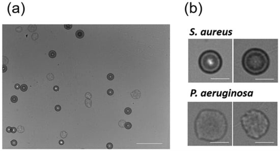 Recently, novel methods for bacterial discrimination have been proposed. For example, matrix-assisted laser desorption/ionization time-of-flight mass spectrometry (MALDI-TOF-MS) is a powerful tool for bacterial discrimination and diagnosis [8,9]. Well-grown colonies of interest are picked, followed by direct ionization of the peptides derived from bacterial cells with the aid of the matrix. The obtained peptide-mass fingerprints provide clues to discriminate bacterial species. Raman spectroscopy is also employed for bacterial discrimination [10]. Analysis with Raman spectroscopy provides structural fingerprints of the molecules contained in the bacterial cells. Bhunia et al. has proposed a simple method for bacterial discrimination based on light scattering patterns from colonies (referred to as bacterial rapid detection using optical scatter technology (BARDOT)) [11,12,13,14,15]. In this method, the bacterial colonies grown on a Petri dish were irradiated by a red laser, followed by generation of light scattering patterns behind the dish. The light scattering patterns can vary depending on the three-dimensional (3D) morphology of bacterial colonies, which are highly species-specific. These methods allow highly accurate and high-throughput analyses. However, these methods need millimeter-scale colonies for accurate discrimination, leading to long assay time. Although, with BARDOT approach, miclocolonies (the diameter range of 100–200 mm) were used for discrimination of Salmonella enterica, Listeria monocytogenes, and Escherichia coli, discrimination of bacteria in the identical genus was not attempted [11]. In addition, these methods still require expensive equipment (e.g., laser and computer-controlled actuators for BARDOT), and thus it is difficult to offer affordable bacterial tests.