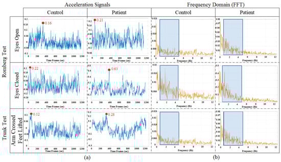 - Kusmirek, S.; Hana, K.; Socha, V.; Prucha, J.; Kutilek, P.; Svoboda, Z. Postural instability assessment using trunk acceleration frequency analysis. Eur. J. Physiother. 2016, 18, 237–244. [Google Scholar] [CrossRef]