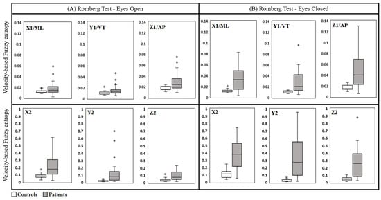 The velocity-based FuzzyEn of patients’ data from Sensor 1 and Sensor 2 presented in Figure 5 were comparatively higher than those of controls demonstrating consistency in terms of complexity of the abnormal cohort across both Romberg and Trunk tests. This can also be observed through the mean values of two cohorts as depicted in Figure 6, where, for the case of Sensor 1, the mean ± STD values of FuzzyEn for controls (: 0.0368 ± 0.0087; : 0.0395 ± 0.01; : 0.0634 ± 0.0123) were slightly lower than that of patients (: 0.051 ± 0.016; : 0.0447 ± 0.0139; : 0.0761 ± 0.0239). Similarly, the mean values of the patients from Sensor 2 were higher than that of the controls (: 0.0337 ± 0.0307; : 0.0579 ± 0.0437; : 0.0744 ± 0.0569) and (: 0.0146 ± 0.0106; : 0.0369 ± 0.027; : 0.0472 ± 0.0303).