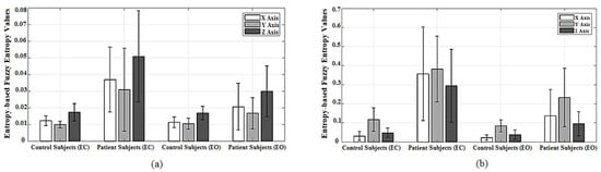 The FuzzyEn values, in all three orthogonal directions (ML, VT and AP), were lower for controls in comparison to the corresponding patients values for both EO and EC captured from Sensor 1 as depicted in Figure 4a. In particular, mean ± STD in EC for controls (: 0.012 ± 0.0029, : 0.010 ± 0.0021 and : 0.017 ± 0.0052) were significantly different to the patients’ corresponding values (: 0.0369 ± 0.0194, : 0.0308 ± 0.0249 and : 0.0509 ± 0.0275) in all three directions, respectively. Indeed, this enhanced significant difference (p < 0.05) for the case of EC is expected in a strong agreement with the clinical observations of wider acceptance. According to the results derived from Sensor 1 as shown in Figure 4a, FuzzyEn values (mean ± STD) in ML, VT and AP directions were lower for the controls under EC condition (: 0.012 ± 0.0029, : 0.010 ± 0.0021 and : 0.017 ± 0.0052) in comparison to patients (: 0.0369 ± 0.0194, : 0.0308 ± 0.0249 and : 0.0509 ± 0.0275) under similar criterion (p < 0.05). Although FuzzyEn was not significantly different within control cohort between EC and EO scenarios, the patients exhibited a more significant difference since EC had a higher mean in entropy values than those for EO in three directions, establishing that the alternate hypothesis holds (p < 0.05). In Figure 4b, the means of FuzzyEn values of patients were significantly higher than those of the controls under EC scenario (: 0.3573 ± 0.2451, : 0.3821 ± 0.1725 and : 0.2948 ± 0.1907) and (: 0.0304 ± 0.024, : 0.117 ± 0.0611 and : 0.0482 ± 0.0248), respectively. For the case of EO, the mean values of entropies presented high separation between the two cohorts in all three axes. However, the standard deviation values from Sensor 2 were considerably higher and relatively equal to the mean values, demonstrating a wider range of values for FuzzyEn in comparison to those of Sensor 1.
