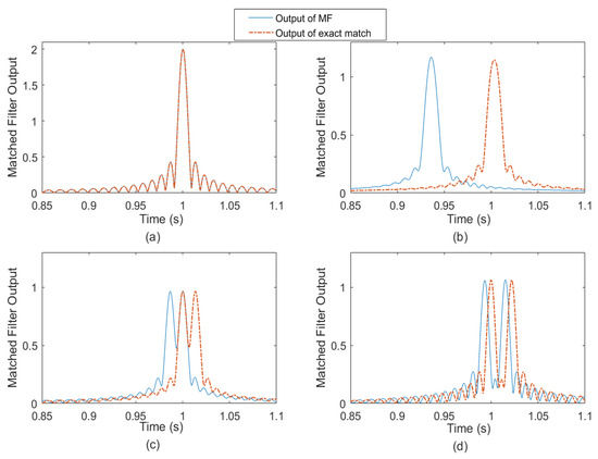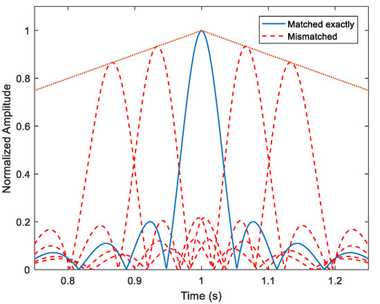 - Compute the time coordinate bias of the dominant highlight, the formula is given as follows:Equation (20) is derived from Equation (13), which is a deduced theoretical conclusion of HFM signal.Cut off the echo by a time window, where the window length is , the starting time of the window is:Set the sampling values outside the window as zero, and then a new echo is constructed:Scan the dictionary and compute the MF outputs times to prepare for the estimation in the next step.
