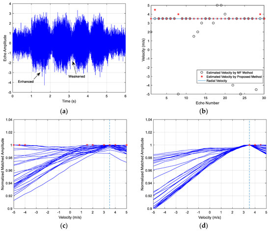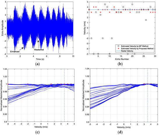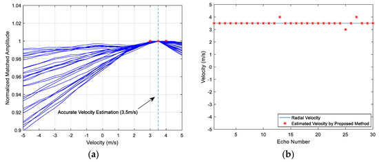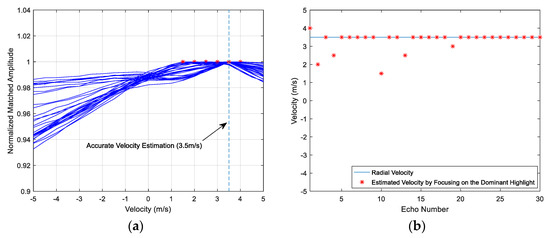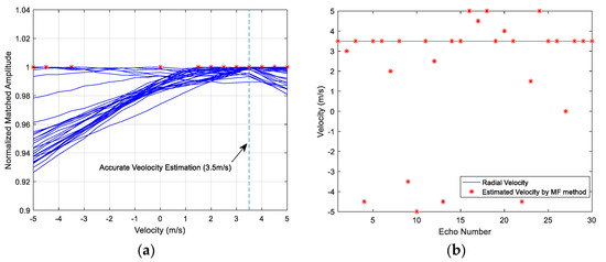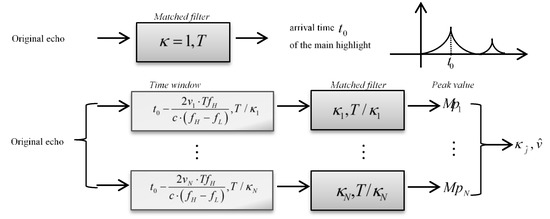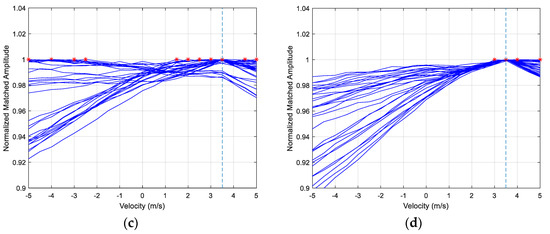 - Extract the correlation peak values of the MF outputs generated in Step 3 to compose the peak value set . The estimated velocity can be obtained through the comparison among the peak values in , as expressed in Equations (18) and (19).