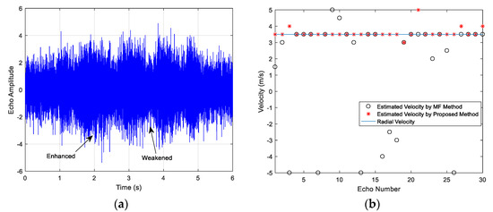 Figure 6b indicates the respective estimation result of the 30 simulations. The horizontal axis denotes the simulated echo number (1~30), and the vertical axis denotes the estimated velocity. The solid line indicates the set radial velocity 3.5 m/s, and each asterisk indicates the result of the corresponding simulation. The statistical results are unsatisfactory for the MF method as they indicate an accuracy of less than 50 percent.