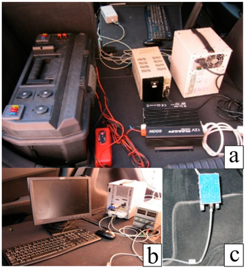 Apart from this, a portable power supply (Figure 1a on the left) was designed by the mechanical engineering department of the University Carlos III in Madrid to be used in an outside test. This battery has different sockets in order to connect different devices at the same time. In the case of this study, this battery was used to plug in not only the data acquisition system, but also the force sensor, DC/AC converter and the adjustable power supply.