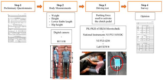 The first questionnaire on the sizes of the subject’s limbs was designed to be filled in before starting the measurement of the applied force on the clutch pedal. Certain main classification parameters such as weight, height and driving experience were collected. More information related to this point can be found in Section 3.3.1.