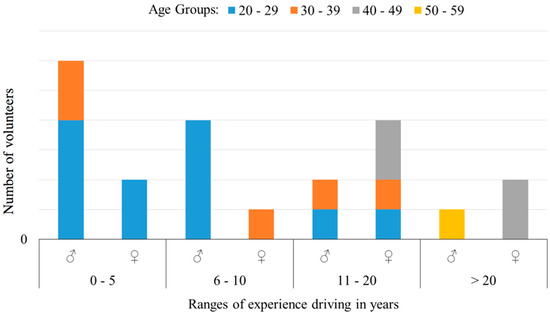 Also, the number of men and women who took part in the experiment and their driving experience is plotted in Figure 4.