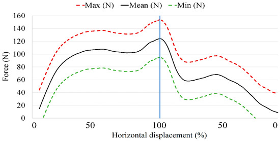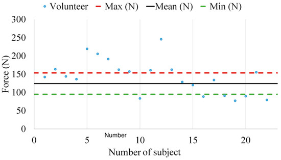 The maximum force applied by each volunteer throughout the trial has been represented by the means of blue points in Figure 9. In addition, the maximum (red), mean (black) and minimum (green) peak values obtained in Figure 5 were plotted.
