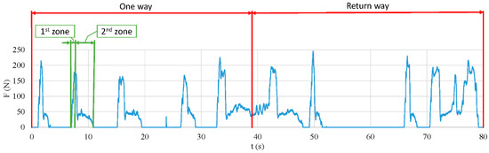 Taking that information into consideration, Figure 6 was plotted. It represents a complete curve of the forces exerted on the clutch pedal during a complete test drive. Each new peak represents a gear change. Also, Figure 6 is divided into two red areas, the one way area and the return way area.