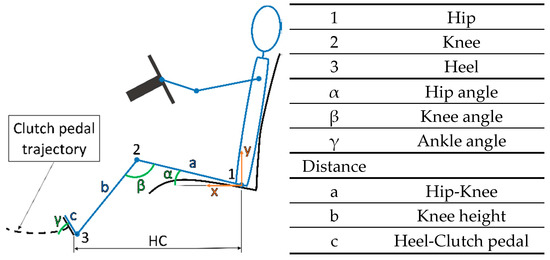 - The first position with the seat as far as possible from the clutch pedal. The distance between the clutch pedal and the hip of the driver (HC) was set in 1 m (Figure 3a).