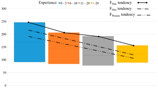 Following with Figure 10, it is important to highlight how the maximum force applied in every experience category is less than the maximum force in the previous one. Also, there is a decreasing tendency not only in men but also in women with a similar slope in the tendency curve. This means that there is a dependency between the force and this tendency. Furthermore, the difference between the maximum and the minimum force of the second, third and fourth range is smaller than in the first range (driving experience between zero and five years). Globally, it can be said that there is a decreasing trend, and this is probably due to the familiarity and the acquired “know how” with previous experience.