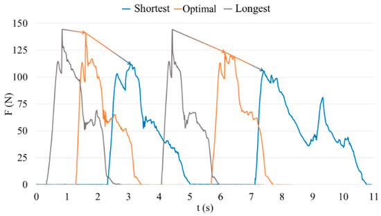 In line with the explanation in Section 3.2.2, Figure 12 represents with a blue line the applied force with the shortest distance (HC = 0.75 m) between the driver and the clutch pedal, the orange line with the optimal position (HC = 0.94) and the grey line with the longest horizontal distance (HC = 1 m).