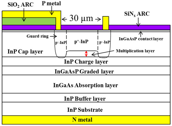 Avalanche photodetectors (APDs) are essential components in optical fiber communication, featuring high sensitivity [1,2,3,4] based on internal current gain. Optical fiber communication systems are now expected to provide >10 Gb/s to meet the growing demand for bandwidth in local area networks [5,6,7], metropolitan areas, and long-haul optical links [8,9]. High-speed InP-based APDs are preferred over PIN-type photodetectors [10], particularly for conventional long-haul applications. The preferred solution in these situations is the separate absorption, grading, charge, and multiplication (SAGCM) structure, due to its low dark current [11,12,13,14], high quantum efficiency, and high gain-bandwidth product [15,16,17]. The importance of performance and reliability in these systems [18,19] has prompted research on epitaxy and device processing for the further development of high-performance and high-speed planar InP based SAGCM-APDs [20,21,22,23,24].
