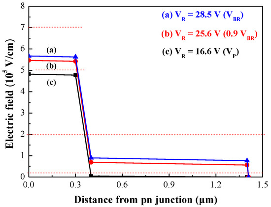 In conventional InP-based SAGCM APDs, light absorption and carrier multiplication processes are kept separate by employing an absorption layer (InGaAs) with a small bandgap (Eg = 0.75 eV) and a multiplication layer (InP) with a large bandgap (Eg = 1.35 eV). Three InGaAsP grading layers are used to shift the bandgap from 0.75 eV to 1.35 eV to assist in the transport of carriers generated in the absorption layer into the multiplication layer. In an SAGCM structure, it is essential that the electric field distribution is optimized in the absorption and multiplication layers. The role of the charge layer is to maintain a high electric field for the multiplication layer and a low electric field for the absorption layer to prevent high-field induced current tunneling. Previous studies have reported maximum electric field intensities of 7 × 105 V/cm in the n-InP multiplication layer and 2 × 105 V/cm in the n−-InGaAs absorption layer [26], due to the generation of band-to-band current tunneling beyond this specific field intensity. Furthermore, the n-InP multiplication layer requires electric field intensity of >5 × 105 V/cm to achieve carrier multiplication via impact ionization and rapidly sweep out the carriers generated in the n−-InGaAs absorption layer (i.e., before recombination). The electric field intensities in the n−-InGaAs absorption layer must exceed 2 × 104 V/cm. Table 1 lists the structural parameters of the SAGCM-APD proposed in this work. Figure 2 presents the electric field profile, which was calculated as a function of the distance from p-n junction under various reverse bias voltages. The electric field intensity profile is well controlled to the required field range for the InP multiplication layer (5 × 105–7 × 105 V/cm) and the InGaAs absorption layer (2 × 104–2 × 105 V/cm).