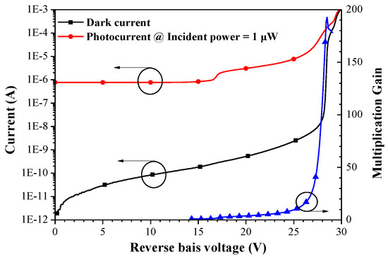 Figure 3 presents the dark current, photocurrent, and multiplication gain of conventional APD diodes as a function of reverse bias voltage. The photocurrent was obtained under 1 μW illumination using a high-power 1550 nm distributed feedback laser diode (DFB-LD) source through an optical attenuator. The breakdown voltage (VBR) of 28.5 V is defined as the voltage under dark current (10 μA), whereas the punch-through voltage (VP) of 16.6 V is defined as the voltage applied to the APD with the depletion region extending into the InGaAs absorption layer at room temperature. The dark current (ID) was 2.99 nA at VBR of 90% and 0.21 nA at VP. At a temperature of 300 K and illumination of 1 μW, we achieved responsivity of 9.61 A/W and multiplication gain of 11.9 at 0.9 VBR. In contrast, we obtained a responsivity of 23.30 A/W and multiplication gain of 28.1 at 0.95 VBR. The maximum multiplication gain at the VBR was 192.