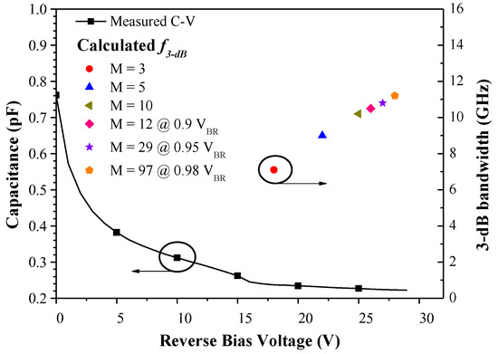 Figure 4 presents the capacitance and calculated 3-dB frequency (f3-dB) of the fabricated APD (bonded to a ceramic sub-mount for testing) as a function of reverse bias voltage. The total capacitance of the fabricated APD included the capacitance of the p-n junction (Cp-n), the capacitance of the bond-pad (Cbp), and the capacitance of the bridge-connection (Cbc), in parallel connection mode. Cp-n depends on the area of the p-n junction and the applied reverse bias voltage. However, Cbp and Cbc depend on the area of the metallization electrode and the thickness of the dielectric film beneath the metallization electrode. The initial total capacitance under zero voltage was 0.726 pF, which decreased to 0.226 pF following the application of biasing at 0.9 VBR. We observed a kink in the capacitance–voltage (C-V) curves at 15–17 V, which is in good agreement with the VP in the photo I-V curves under a punch–voltage of 16.6 V. We sought to predict the 3-dB bandwidth (f3-dB) frequency response of the proposed APD using C-V data, using the following equations: