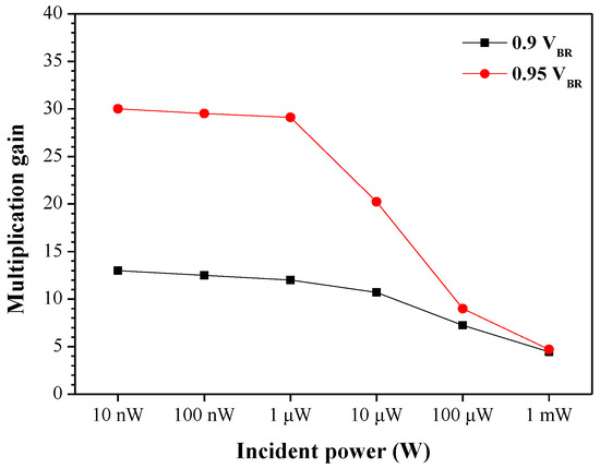 Figure 5 presents multiplication gain as a function of incident power from 1 nW to 1 mW under bias voltages of 0.9 VBR and 0.95 VBR. Multiplication gain was shown to decrease with an increase in incident power. APD biased at a higher voltage and illuminated using lower incident power resulted in far higher gain; however, we observed a significant decrease in multiplication gain when the incident power exceeded 1 μW. This is an indication that suitably low incident power was required for APD operations in regions of high multiplication gain.