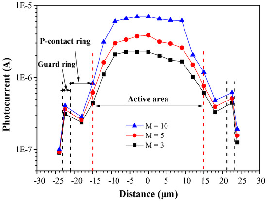 Figure 6 presents the photocurrent as a function of distance across the active area (diameter) of the proposed SAGCM-APD. Incident light was delivered using a DFB laser via a fiber coupler lens at a wavelength of 1550 nm with power of 1 μW. The light-spot of the fiber coupler lens was moved in steps of 3 μm. Higher photocurrent values were obtained when the APD was operated using higher multiplication gain. We did not observe a significant spike at the edge of the active region in any of the photocurrent curves when the multiplication gain was varied between three and 10. This demonstrates the efficacy of the proposed structure in suppressing edge-breakdowns. Furthermore, the proposed APD achieved responsivity of 0.82 A/W when operating under multiplication gain of three to 10.