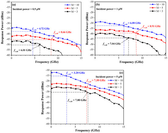 Figure 7 presents the measured f3-dB as a function of multiplication gain (3, 5, and 10) under incident optical power of 0.5 μW, 1.0 μW, and 5.0 μW, as measured with load resistance of 50 Ω using an HP 8703A lightwave component analyzer. The response power of the APD increased with an increase in incident power. The response power of the APD also increased when the APD was operated under higher multiplication gain. The f3-dB increased with an increase in multiplication gain from three to five and then decreased when the multiplication gain exceeded 10, in the cases where the incident power was 0.5 μW or 1.0 μW, as shown in Figure 7a,b. In contrast, f3-dB decreased with an increase in the multiplication gain increased in the cases with an incident power of 5.0 μW, as shown in Figure 7c. In this work, we obtained a maximum f3-dB of 8.91 GHz at an incident power of 1.0 μW and multiplication gain of five. At an applied incident power of 1.0 μW, the measured f3-dB values when using multiplication gains of three and five were 7.04 and 8.91 GHz, respectively. In contrast, the calculated f3-dB using the multiplication gains of three and five were 7.09 and 9.0 GHz, respectively. The measured f3-dB values are in good agreement with the calculated f3-dB values. In contrast, at an applied incident power of 1.0 μW and multiplication gain of 10, the measured f3-dB was 6.08 GHz whereas the calculated f3-dB was 10.2 GHz. The difference between 10.2 GHz and 6.08 GHz can be attributed to the considerable avalanche build-up time required under high multiplication gain.