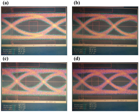 Eye diagrams obtained using the proposed SAGCM-APD photodetector chip operated under a multiplication gain of 5 using nonreturn-to-zero (NRZ) pseudorandom codes with length of 231-1 at (a) 10, (b) 11, (c) 12, and (d) 12.5 Gb/s.