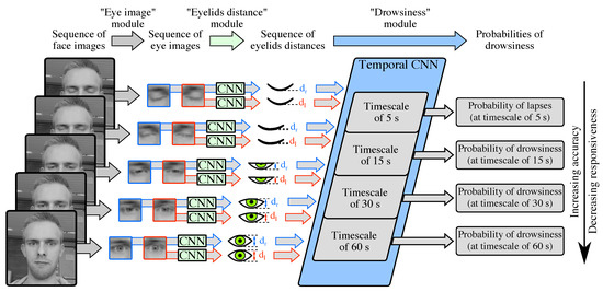 Overview of our multi-timescale drowsiness characterization system operating on any given 1-min sequence of face images. First, from each face image, the “eye image” module produces two eye images (left and right) via off-the-shelf algorithms. Second, from each eye image, the “eyelids distance” module produces the eyelids distance via a convolution neural network (CNN). Third, from the 1-min sequence of eyelids distances and via a temporal CNN, the “drowsiness” module (1) extracts features related to the eye closure dynamics at four timescales, i.e., the four most-recent time windows of increasing lengths (5 s, 15 s, 30 s, and 60 s), and (2) produces four probabilities of drowsiness of increasing accuracy, but decreasing responsiveness.