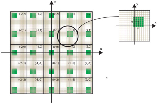 - Shifted cropping. A portion of (L × V) pixels of every EIs is cropped as in Figure 2. Shifting the cropped region with a constant step between adjacent EIs, allows setting the reference plane of the final image. This sets the portion of the 3D scene that will be reconstructed inside and outside the InI display, changing the depth sensation. More details on the parameters used in this step are given in Section 3.2.