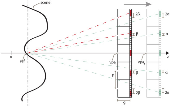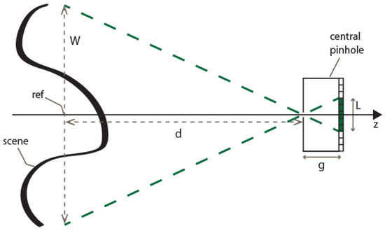 - EIs capturing. The EIs are generated using a VPA. The number of virtual pinhole cameras in vertical (horizontal) direction is set equal to the number of pixels behind each microlens of the InI monitor in vertical (horizontal) direction. To capture EIs, the VPA is placed far away from the scene. A trade-off between the resolution of the EIs and the absence of black pixels depends on the position of the VPA. If the VPA is set too close to the point cloud, some information of the scene is lost and black pixels appear in the EIs (for the same reason as in [12,13]). On the other hand, as the VPA is moved further from the point cloud, black pixels’ issue disappears, but the scene is captured in the EIs with lower resolution. Therefore, the position of the VPA is set empirically at the minimum distance from the point cloud that ensures the absence of black pixels. Then, this value is refined to set the reference plane’s position, as explained in Section 3.2.