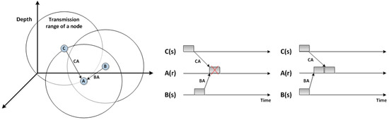 Figure 2 shows how the high propagation delay in UWSNs could make a spatial-temporal uncertainty problem. This figure illustrates two cases of the spatial-temporal uncertainty problem. Firstly, when nodes B and C transmit packets with varying times of transmission, a collision might occur at node A. In the second case, when both nodes B and C start transmitting to node A simultaneously, there is no collision as their packets arrive at node A at different times. This is mainly because of various propagation delays.