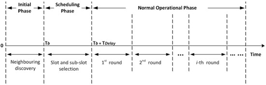 Nodes in the network operate in three phases; namely initial, scheduling, and normal operational phase, as depicted in Figure 3. All network nodes operate asynchronously during each phase but share a common clock to start and end each phase together. To eliminate the effect of any clock drift that may occur over a long period of time, a guard time is also applied.