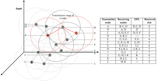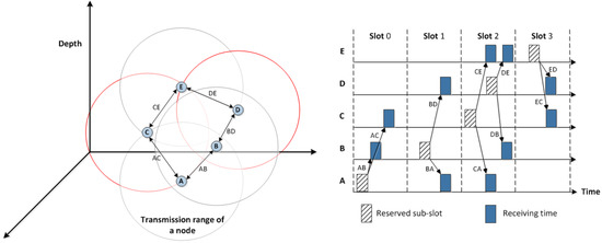 As an example shown in Figure 2, the depth of nodes A, B, and C are assumed to be 500 m, 450 m, and 420 m, respectively. The network depth is 500 m and is set as 30 s. Using Equation (2), the scheduling time of node A, B, and C can be calculated as 0, 1.579, and 2.609 s, respectively. It shows that Equation (2) can prioritise sensor nodes based on their depth and the difference between their transmission times is long enough to avoid any overlapping.
