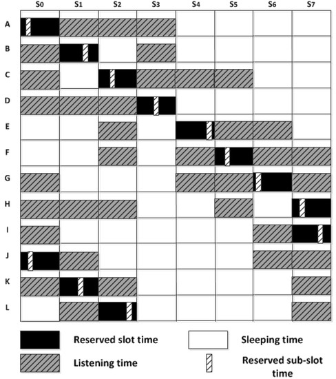 - Van Hoesel, L.; Nieberg, T.; Kip, H.; Havinga, P.J. Advantages of a TDMA based, energy-efficient, self-organizing MAC protocol for WSNs. In Proceedings of the 2004 IEEE 59th Vehicular Technology Conference, Milan, Italy, 17–19 May 2004; pp. 1598–1602. [Google Scholar]